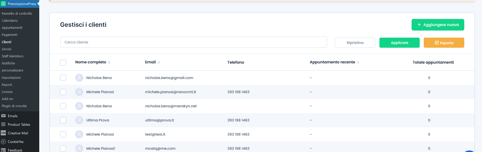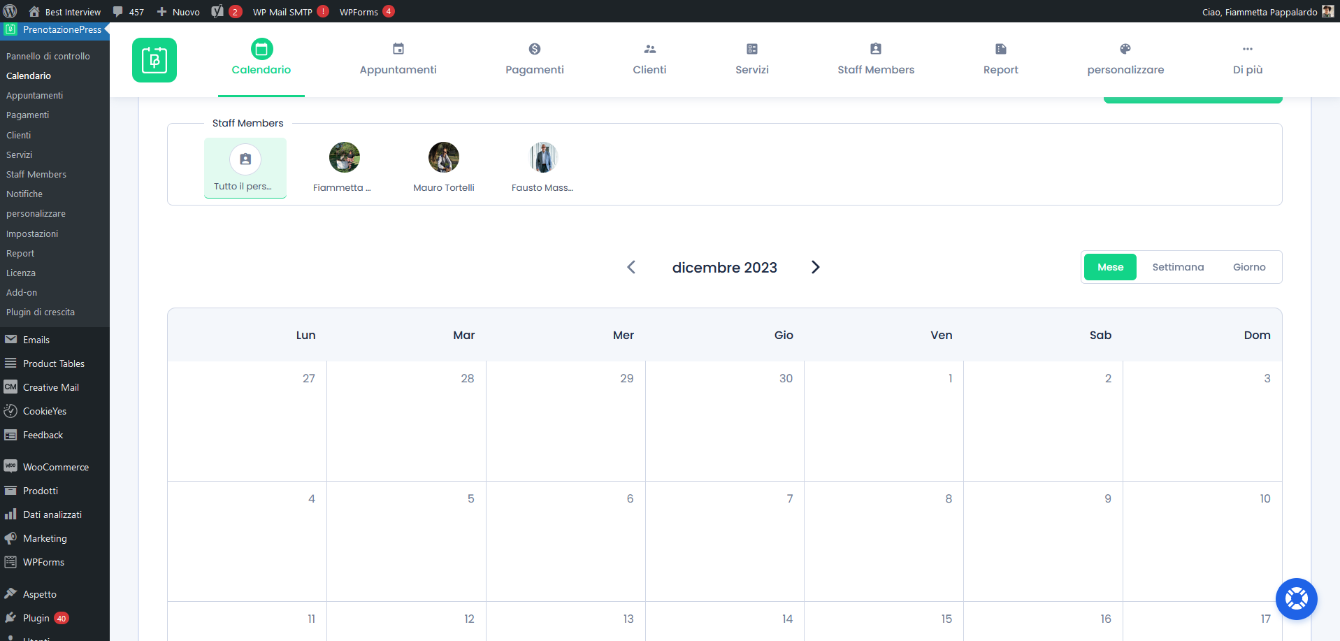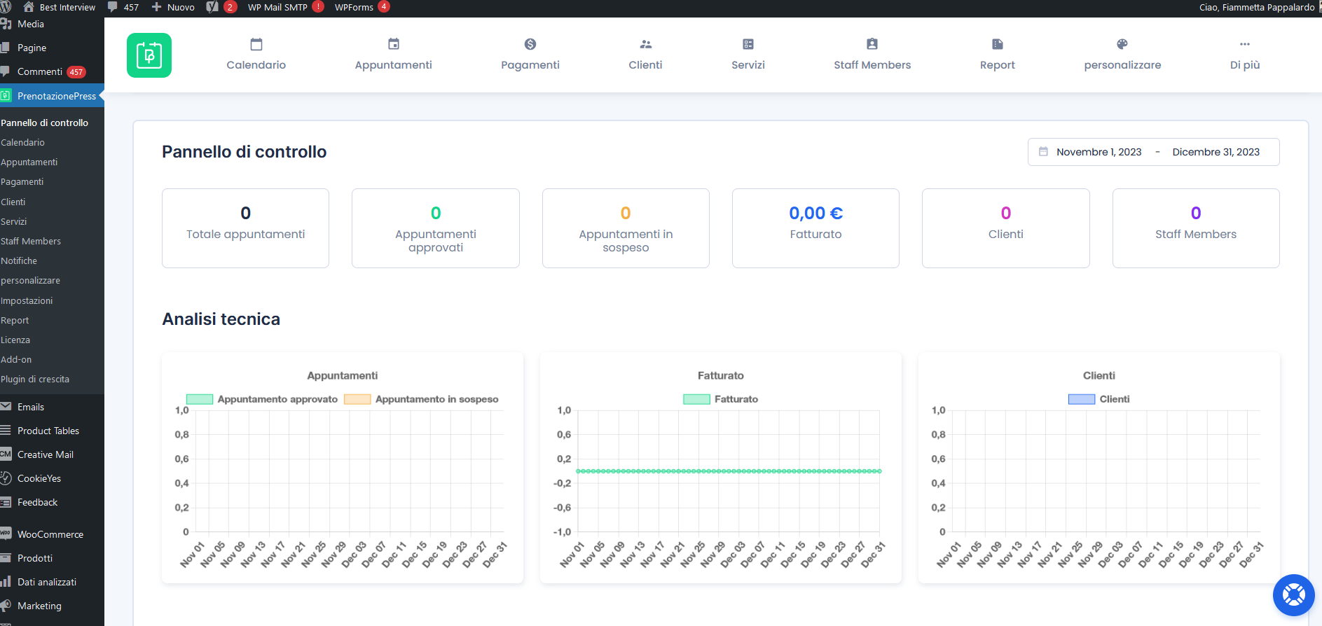 Il pannello di controllo permette di accedere agevolmente a tutte le sezioni che permettono di controllare il calendario e gli appuntamenti, l’inserimento di servizi e dei membri dello staff ed eventualmente personalizzare le componenti del plugin.