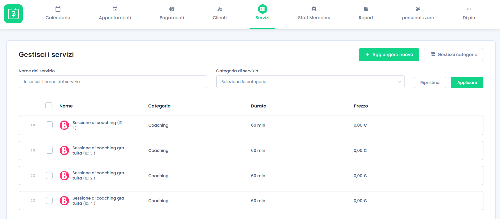 Pagina di gestione dell’elenco dei servizi che l’azienda può erogare, alcuni di questi servizi sono presenti anche nell’e-commerce, altri sono solo ad uso interno e che possono essere richiamati dai membri dello staff (ad esempio sessioni omaggio)