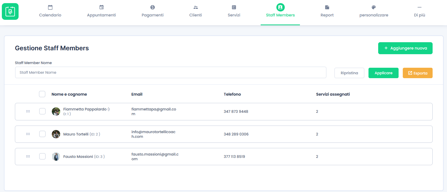 Pagina di gestione dei componenti dello staff, al momento è già stata predisposta, ma è possibile inserire o rimuovere persone che possono gestire il calendario e gli appuntamenti